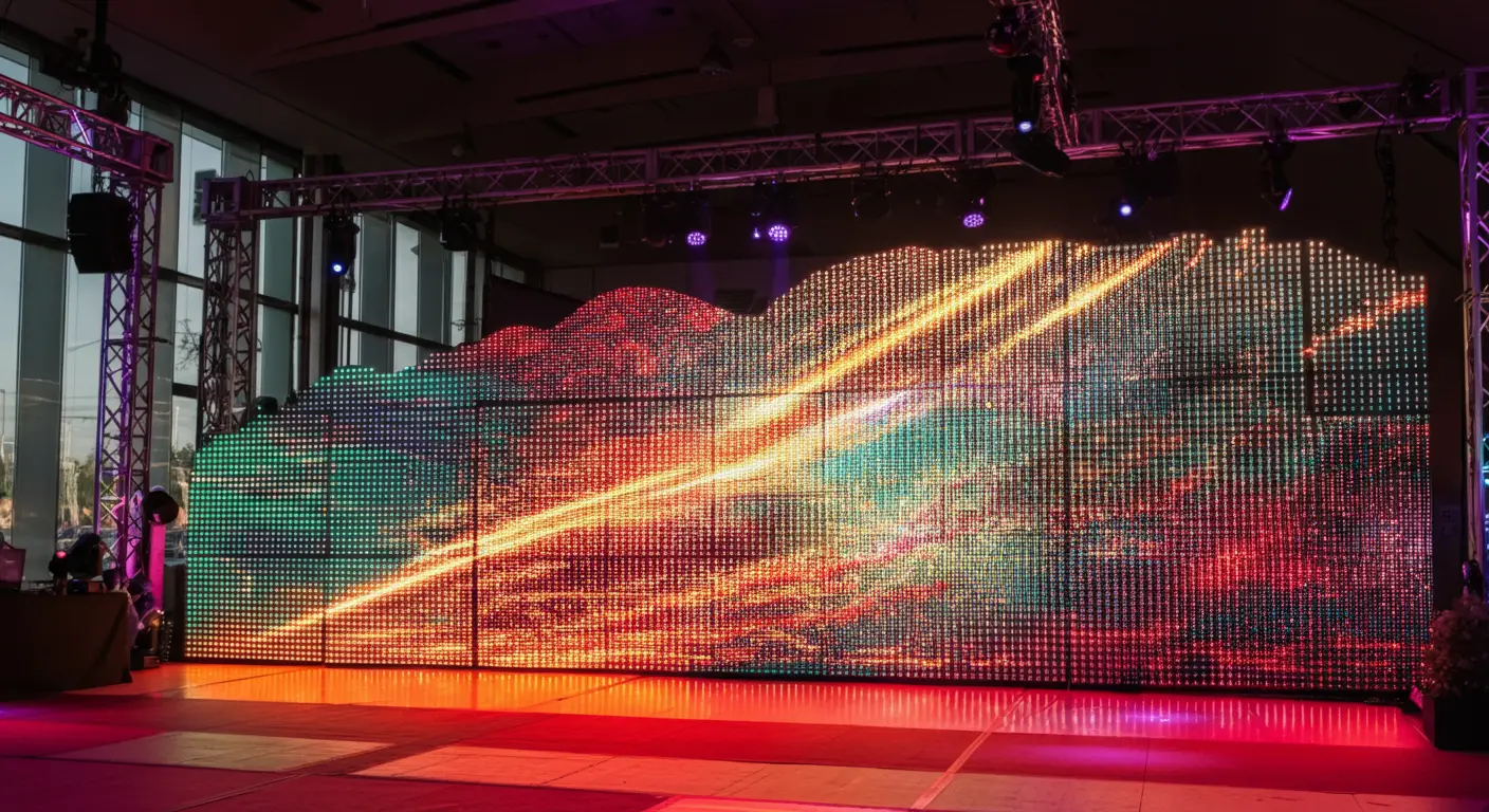 Indoor LED panels showcasing sharp and bright visuals in a hall.